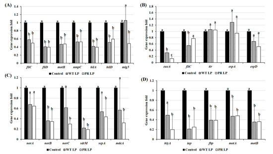 Moreover, these MDR efflux pump genes are involved in an increased virulence activity in S. aureus to the host’s gastrointestinal tract. In order to assess the roles of CFCSs of LP+PR against S. aureus, we selected MDR efflux pump genes norA, norB, norC, sdrM, sepA, as well as methicillin resistance mediatory gene mecA in the presence of CFCSs from LP+PR strain. A significant alteration of MDR efflux pump genes and mecA gene were detected when the S. aureus was pretreated with CFCSs of LP or LP+PR. Fournier and Hooper, (2000) [41] investigated MDR efflux genes and found that they can be involved in S. aureus adhesion. Flagella and motility related genes from L. monocytogenes are essential for initial cell surface attachment and cell invasion activities [42,43]. Therefore, we tested the L. monocytogenes virulence genes such as hlyA, iap, fbp, motA, and motB in the presence of CFCSs of LP+PR. Remarkably, the virulence gene expression was significantly downregulated by LP+PR strain. These virulence genes results are correlated with cell adhesion and invasion abilities of S. Typhimurium, EHEC, S. aureus, and L. monocytogenes to INT-407 cells. The results from our study clearly demonstrate that mutant LP+PR strain showed similar or better probiotic properties than wild-type LP strain.
