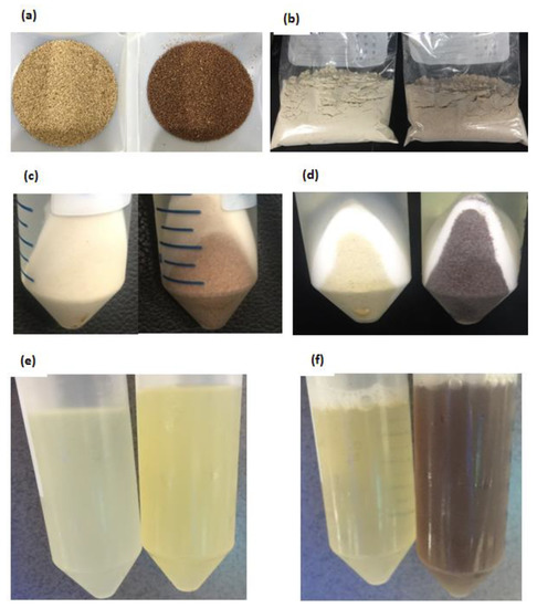 All six teff seed samples were ground and used for three different protein fractionation methods, during which color changes in residues and supernatants were monitored. The pictorial data from Mekel-W and Mekel-B during Method 3 extraction procedures were selected as representatives because the same results were observed for all samples (See below). The two seed types have indubitably different colors with linen white and brown colors, respectively (Figure 1a,b). However, the difference in color became less pure when finely ground (Figure 1c,d).