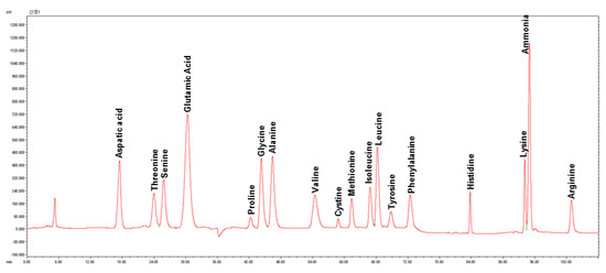 Representative chromatogram showing amino acid profile of teff seed flour (Addis-W). Y-axis is intensity (mAu); X-axis is retention time (min).