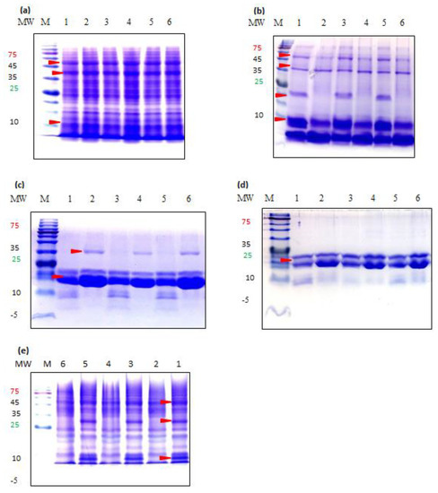 - Laemmli, U.K. Cleavage of Structural Proteins during the Assembly of the Head of Bacteriophage T4. Nature 1970, 227, 680–685. [Google Scholar] [CrossRef]