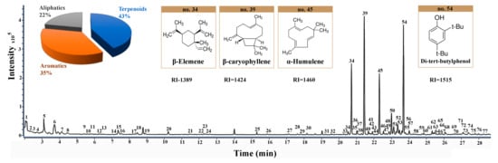 3.4. Volatile Components’ Characterization by SHS-GC-MS