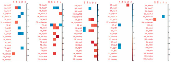 However, the VL muscle was close to the ST muscle for many biomarkers, especially Hsp70-1a, grp75 and mybph.