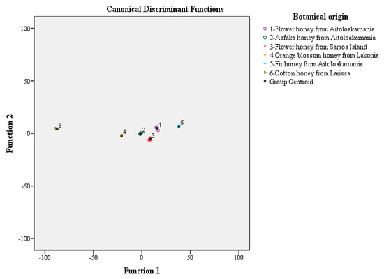 The first discriminant function showed the higher eigenvalue (1680,290) and canonical correlation of 1.000, whereas it accounted for 97.3% of total variance; the second discriminant function showed an eigenvalue of 36.061, canonical correlation of 0.986 and accounted for 2.1% of total variance; the third discriminant function showed an eigenvalue of 6.295, canonical correlation of 0.929 and accounted for 0.4% of total variance; discriminant function 4 showed a lower eigenvalue (3.633), a weaker canonical correlation (0.886) and explained 0.2% of total variance; discriminant function 5 showed the lowest eigenvalue (1.522), the weakest canonical correlation (0.777, whereas explained only 0.1% of total variance. All Dfs accounted for 100% of total variance. The unstandardized canonical discriminant functions evaluated at group means, the group centroids, had the following values: (15.597, 4.858), (−1.623, −0.323), (8.421, −5.520), (−20,929, −2.154), (38.207, 6.755), (−87.627, 4.378) for flower honey from Aitoloakarnania, Asfaka honey from Aitoloakarnania, flower honey from Samos Island, orange honey from Lakonia, fir honey from Aitoloakarnania, and forest flowers honey from Zagorochoria, respectively.
