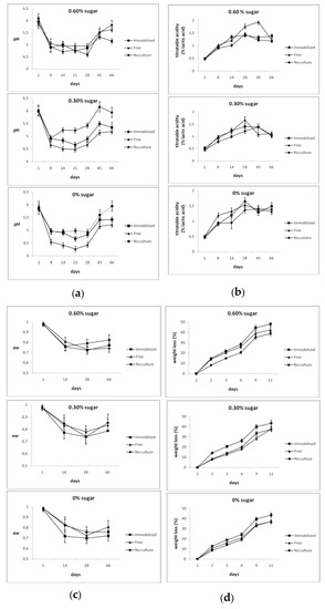 A significant (p < 0.05) increase in titratable acidity and a significant (p < 0.05) decrease in pH, water activity (Aw), and weight loss were noted during maturation in all samples. However, an increase (p < 0.05) in pH was observed at the late stages of ripening, probably due to ammonia formation by amino acid degradation [27]. The highest (p < 0.05) titratable acidity (1.93% lactic acid) was observed in dry-fermented sausages with free cells containing 0.60% sugars after 45 days of ripening.