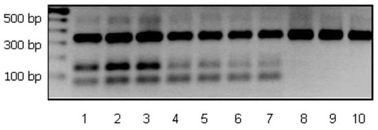 Molecular identification of L. casei ATCC 393 at levels ≥6 log cfu/g in probiotic dry-fermented sausages after 66 days of ripening applying strain-specific multiplex PCR assay after lactobacilli enumeration with microbiological analysis. Lane 1: Pure culture of L. casei ATCC 393 served as a positive control. Lane 2: Dry-fermented sausage containing 0.6% sugar and immobilized L. casei ATCC 393. Lane 3: Dry-fermented sausage containing 0.3% sugar and immobilized L. casei ATCC 393. Lane 4: Dry-fermented sausage containing no sugar and immobilized L. casei ATCC 393. Lane 5: Dry-fermented sausage containing 0.6% sugar and free L. casei ATCC 393. Lane 6: Dry-fermented sausage containing 0.3% sugar and free L. casei ATCC 393. Lane 7: Dry-fermented sausage containing no sugar and free L. casei ATCC 393. Lane 8: Dry-fermented sausage containing 0.6% sugar and no starter culture. Lane 9: Dry-fermented sausage containing 0.3% sugar and no starter culture. Lane 10: Dry-fermented sausage containing no sugar and no starter culture.