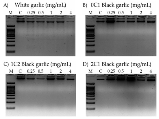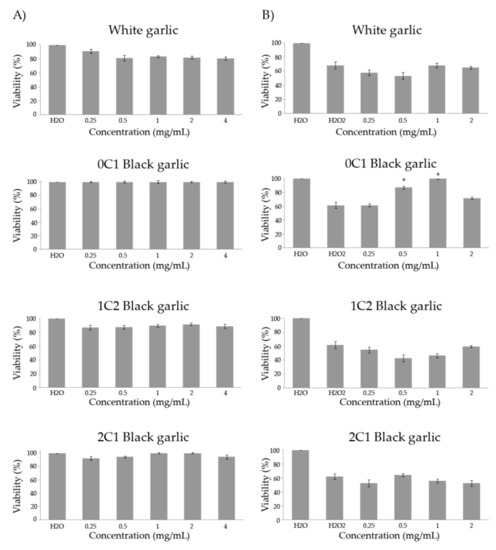 In general, garlic has significant antioxidant activity and protective effects against oxidative DNA damage regardless of the processing method [62]. Our antitoxicity and antigenotoxicity results showed that 0C1 black garlic (aged for 13 days) is able to protect from the genomic damage of this genotoxin in a dose-dependent manner. This effect could probably be due to the antioxidative and free-radical scavenging capacity of their respective organosulfur compounds, which agree with previous reports [14,63,64]. Besides the antioxidant activity, our results about the stronger antioxidant activity shown by black garlic, compared with fresh garlic, are in agreement with previous in vivo and in vitro garlic assays [65,66].