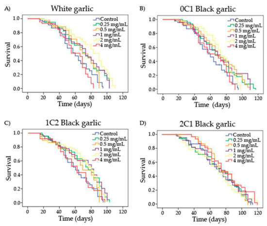 Survival curves of D. melanogaster fed with different concentrations of garlic (black and white) over time. A) White garlic, B) 0C1: black garlic with 13 days aging, C) 1C2: black garlic with 32 days aging and D) 2C1: black garlic with 45 days aging.