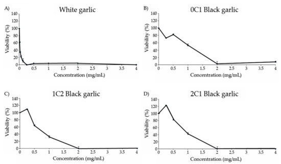 Viability of HL-60 cells treated with different concentrations of black and white garlic for 72 h. (A) White garlic, (B) 0C1: black garlic with 13 days aging, (C) 1C2: black garlic with 32 days aging, and (D) 2C1: black garlic with 45 days aging.