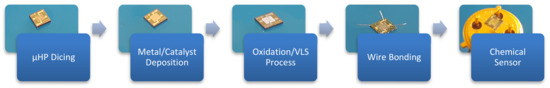 The schematic workflow used for the preparation of the sensing devices is reported in Figure 2. In this experimental work, micro-hotplates were diced individually for greater ease in preparing samples at the prototype level. However, due to the high scalability of the process, all operations could be performed at wafer level, which is a fundamental requirement of mass-scale production of the devices. After the μHPs dicing, a metal/catalyst layer was deposited by magnetron sputtering according to the specific metal oxide nanowires. Finally, samples were oxidized/underwent the VLS process to synthetize the nanowires directly on the hotplates. Functional sensors require a capped hosting case to interface with the external electronics and to protect the sensing element. Therefore, μHPs were mounted on the “transistor outline” TO4 package. Pads were connected to TO pins by electro-soldering 50 µm gold wires.