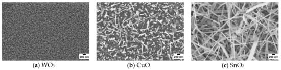 Figure 4 reports some SEM images of WO3, CuO, and SnO2 nanowires at the same magnification level. The density and the dimensions of nanowires are strongly dependent on the material and on the synthesis technique used. Tungsten oxide nanowires are very small and dense with an average diameter of about 20–30 nm [62]. The mat of copper oxide nanowires is less dense than WO3, and the average diameter is in the range of 70–100 nm [63]. In the case of tin oxide, a dense mat is obtained, but the nanowires are irregular and very long (few μm). It is more difficult to control the geometry of the wires, and thus their diameters are spread over a wide range (100–250 nm).