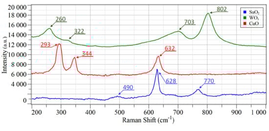 As reported previously, on tungsten oxide samples, the Raman shifts at 260, 322, 703, and 802 cm−1 could be attributed mainly to the monoclinic phase of WO3 (Figure 5, green line) [62,74,75]. The bending vibration of the O–W–O bonds generated the first two shifts. The peaks at 703 and 802 cm−1 instead corresponded to W–O–W stretching vibrations of the bridging oxygen. Raman measurements performed on CuO samples confirmed the monoclinic crystalline phase of CuO, commonly found in tenorite rocks (Figure 5, red line). The three predicted Raman active lattice modes were detected at 293 cm−1 (Ag), 344 cm−1 (Bg), and 632cm−1 (Bg), in line with literature values [76]. Additionally, for the last observed batch of samples, Raman investigations identified shifts that matched the one reported in literature for the tetragonal phase of SnO2 (Cassiterite, Figure 5, blue line) [77]. The three detectable Raman active modes of tin oxide that were observed were Eg (490 cm−1), A1g (628 cm−1), and B2g (770 cm−1).