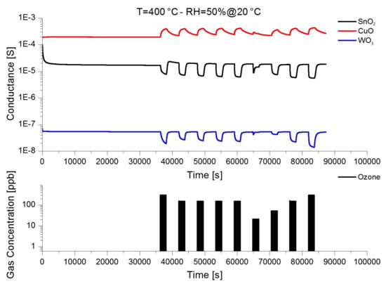 As discussed already, the most common working principle of devices integrated in electronic noses is the change of the electrical conductance due to the interaction of the chemical species in the atmosphere with the surface of the sensing material [78]. Essentially, conductometric chemical sensors work as resistors in which the electrical resistance of the sensing layer is modulated by the adsorption or the interaction of chemical species with the surface. Figure 6 shows the electrical conductance of three different devices in the presence of ozone, a typical oxidizing gas. The effect of adsorbed species on the surface of the metal oxide depends on the nature of the semiconducting material. In the case of n-type materials such as SnO2 and WO3, the presence of a oxidizing gas, such as ozone, led to a reduction of free electrical charge on surface, thus decreasing the overall electrical conductance. In a p-type material such as CuO, the presence of oxidizing gas led to an increase of the conductance [79].