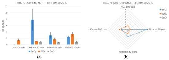 (a) Comparison of different sensing materials towards specific concentrations of target chemical compounds. (b) Polar graph of the response spectra of the devices. Operating temperature for all sensing devices was 400 °C towards ethanol, acetone, and ozone, while it was 200 °C for nitrogen dioxide. Relative humidity was 50% at 20 °C.