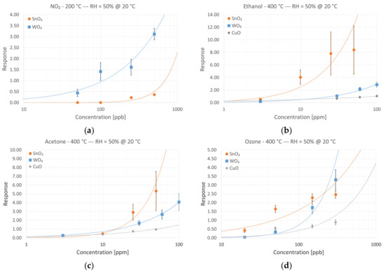 In electronic noses, each sensor of the array can be powered at the desired temperature according to the specific compound fingerprints to detect. According to micro hotplate specifications, investigations were limited to 400 °C to avoid any damage during long-time operation, such as membrane breakdown caused by thermal stress. In this specific case, a temperature of 400 °C was selected as the optimal one for the detection of ethanol, acetone, and ozone, while for nitrogen dioxide, 200 °C was chosen. These values are in line with previous investigations [62,63,68].