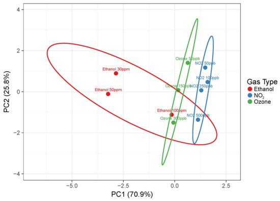 Principal component analysis (PCA) is by far the most used unsupervised data algorithm to manage the information coming from an electronic nose. It mainly consists of a linear extraction technique that reduces data dimensionality with a minimum loss of information, projecting them into lower dimensions (usually two or three) [20]. Figure 9 reports PCA performed using the data previously presented. As expected, efficient discrimination between ethanol and acetone was very difficult using only the three sensors integrated in the array. Therefore, acetone was not included in this representation. However, it would be possible to add new sensors to the array when integrated in the electronic noses, potentially increasing the number of different sensors up to thousands, which would allow for more likely discrimination of specific fingerprints [78]. Nevertheless, WO3, SnO2, and CuO devices were able to discriminate between ethanol, ozone, and nitrogen dioxide at low concentrations, demonstrating the capability of the fabricated sensor array to distinguish the correct food preserver.