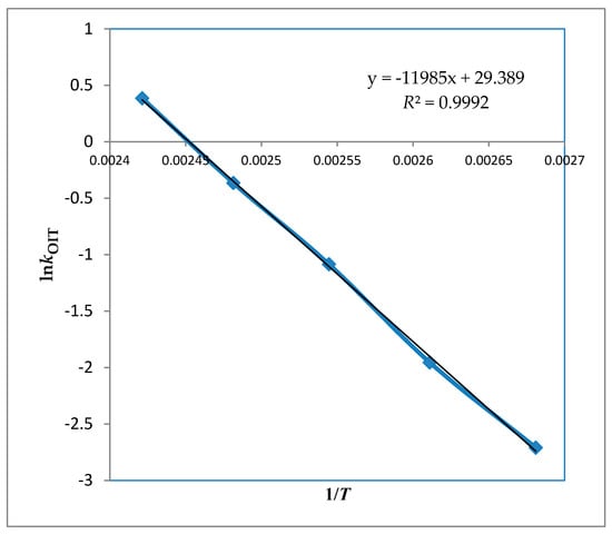 Estimated Arrhenius parameters for avocado oil oxidation on isothermal conditions (lnkOIT vs. 1/T).