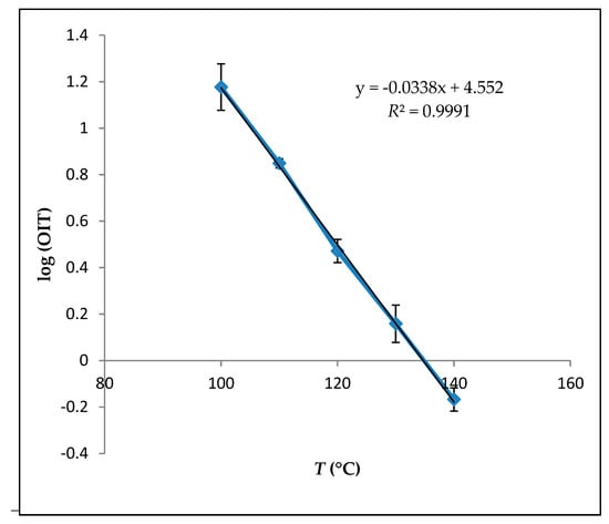 As shown in Figure 1, ln (k) vs. 1/T was obtained from the measurements. Those values were used to obtain activation energy and pre-exponential factor. The slope was used to calculate Ea while intercept used for A (frequency factor) as explained in (R2 > 0.99). More specifically, k and T values have a semi-logarithmic relationship with a linear dependency with good correlation of determination (R2 > 0.99). Duncan’s multiple range tests were calculated for OIT assay and statistically significant (p < 0.05) difference was found at all temperatures. The results indicate that the reaction rate constant increase with increasing temperature, which means that the oil oxidation is faster at higher temperatures as authors expected. Noteworthy, the kinetic rate constant prediction, especially at lower temperatures, has some limitations which cause some uncertainties and errors. Those limitations are linked with the test. Specifically, the oil follows different pathways of lipid oxidation at lower and higher temperatures depending on the metal ions and antioxidants activity. On the other hand, the degree of oxygen solubility is different in varying temperatures, where literature reporting to see an increase of 25% for each 10 °C.