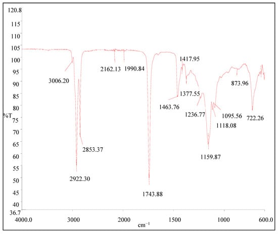 FTIR results are shown in Figure 3. The spectral regions were chosen for developing the regressions with including the fingerprint regions were selected according to the previous researcher's observations [48]. The spectra in the FTIR region have well-resolved bands that can be assigned to presented functional groups of the avocado oil. The spectra are dominated by some peaks at 3006, 2922, 2853, 2162, 1991, 1744, 1464, 1418, 1378, 1237, 1160, 1118, 1096, 874, and 722 cm−1. According to that, the absorbance results for the region of 3006 to 2853 cm−1 are due to the bands of CH2 stretching vibrations, asymmetric and symmetric, respectively. The high value of the frequency of this band indicates its richness in polyunsaturated acyl groups. According to the literature, only linseed oil shows a band frequency as high as this; for example, olive oil shows values near 3005.4, rapeseed oil near 3007.5, and corn oil near 3008.8 cm−1 [49]. So, the frequency value of these bands in avocado oil is similar to those of olive oil. The major peak at 1744 cm−1 arises from C=O stretching vibrations of aldehydes and ketones where the peaks at 1464, 1418, and 1378 cm−1 arise from CH2 and CH3 scissoring vibration of ethers. Meanwhile, 1237, 1160, 1118, and 1096 cm−1 peaks are associated with C–O stretching vibration. The last peak at 722 cm−1 associates with the CH2 rocking mode. Those observations are supported by the results of the other researchers performed with oils [48,50].