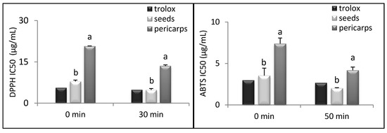 Scavenging of 50% of DPPH and ABTS radical by Trolox and ethanolic extracts from different fruit parts (seeds and pericarps) of exhausted myrtle berries (EMB) at different time points (0 and 30 min). Data were expressed as means ± SD of three independent experiments. Different letters (a,b) indicate significant differences (p < 0.01) between seeds and pericarps of EMB at each time point.