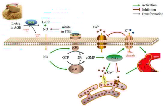 The mechanisms of the antihypertensive properties of garlic extract via increasing the production of nitric oxide (NO) in vascular smooth muscle cells. The l-arginine (L-Arg) in aged garlic extract (AGE) could be transformed into NO and L-citruline (L-Cit) mediated by nitric oxide synthase (NOS). Moreover, the nitrite in the fermented garlic extract (FGE) could be converted into NO in vivo by Bacillus subtilis. NO and atrial natriuretic peptide (ANP) activated particulate guanylyl cyclase (pGC) and soluble guanylyl cyclase (sGC), thus catalyzing the transform of guanosine triphosphate (GTP) to cyclic guanosine monophosphate (cGMP). The elevated cGMP activated PKG, and PKG decreased intracellular Ca2+ concentration by increasing intracytoplasmic Ca2+ transport into the sarcoplasmic reticulum through the sarco/endoplasmic reticulum Ca2+-ATPase (SERCA) pathway, thereby preventing the release of Ca2+ from the sarcoplasmic reticulum to the cytoplasm, and stimulating the Ca2+-activated K+ (BKCa) channel on the cell membrane, as well as reducing the Ca2+ influx. As a result, the vascular smooth muscle relaxed, and the blood vessels dilated.