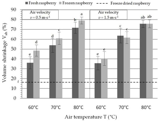 Air temperature and initial state of the raspberry, prior to convective drying significantly changed the volume of dried raspberry. On the other hand, the air velocity did not have any impact on the change in raspberry volume (Table 1). The most considerable changes in volume occurred when drying frozen raspberries at T = 80 °C and air velocity of 0.5 m·s−1 (Vsh = 79.07 ± 4.07%). As previously reported, drying temperature of 80 °C had similar trend on volume shrinkage [17].