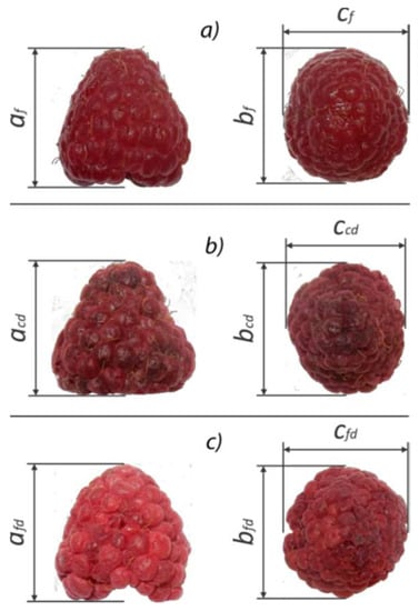 where m0 is the mass of liquid and the immersed sample (kg), ml is the mass of liquid, and ρt is the liquid density (kg/m3). The volumetric shrinkage of raspberries (Vsh) was based on the following equation [28].