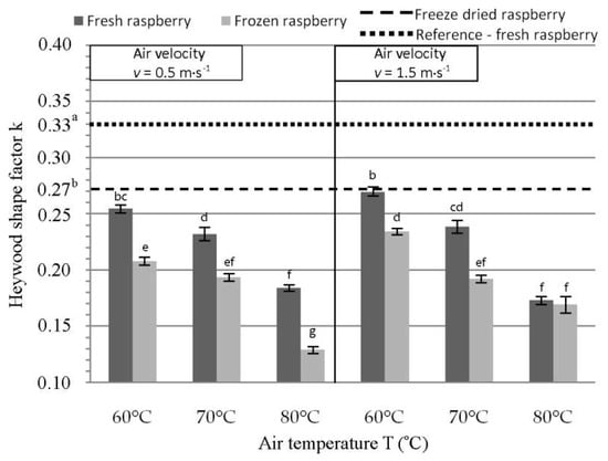 The referent Heywood shape factor before drying of fresh raspberry was k = 0.3323 (Figure 3), and all three experimental factors were significant for the changes in Heywood shape factor. As compared to k of a fresh raspberry, the factor after freeze-drying equaled to k = 0.27. In case of convective drying, the lowest deviation from k occurred for fresh raspberries at T = 60 °C and air velocity of 1.5 m·s−1 (k = 0.2694 ± 0.003). Results showed that under the same experimental conditions, the convective dried frozen raspberries had greater deviation of size as compared to the fresh raspberries. Hence, Heywood shape factor corresponded with the results for volume shrinkage.
