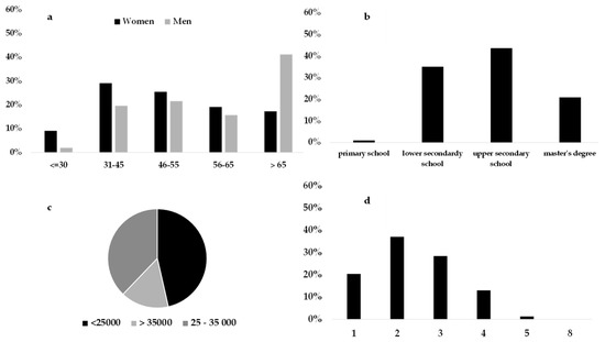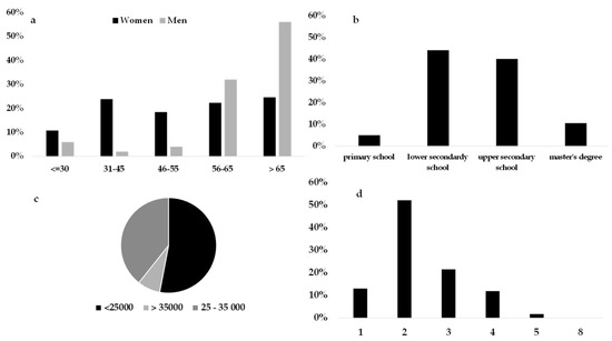Sociodemographic characteristics of consumers belonging to the local sensitive cluster: (a) Gender and age groups proportion, (b) educational level, (c) yearly average income bracket, and (d) number of family components.