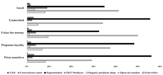 Differences between consumer choices regarding the fruit and vegetable points of purchase emerged from habit exploration of the different consumer clusters (Figure 6).