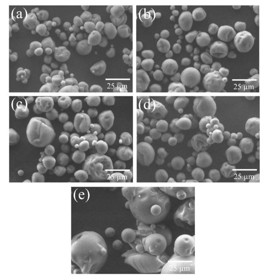 Micrographs of encapsulated blue corn powders obtained by spray drying at different agave fructan addition. (a) 6%, (b) 8%, (c) 10%, (d) 12%, (e) agave fructans. 1000×.