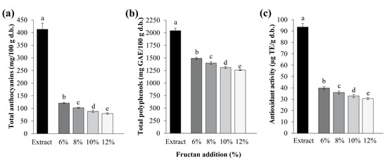 Comparing the encapsulated powders with the extract, a significant decrease (p < 0.05) was observed (Figure 3b). These results indicate that polyphenols are lost during the spray-drying process. This loss is related to the susceptibility of some phenolic acids to degradation and polymerization during exposure to high temperatures and oxygen [12]. Regarding the effect exerted by the fructan addition, the retention percentages ranged from 73.03% to 61.58% for the encapsulated with lower and higher fructan concentration, respectively. The phenolic content of powders is similar to that found by Bakowska-Barczak and Kolodziejczyk [7] in blackcurrant encapsulated at 150 °C with dextrose (1163.5 to 1251.4 mg GAE/100 g) and inulin (967.2 mg GAE/100 g) as carriers. Saikia et al. [12] quantified lower values of total polyphenols (535 to 825 mg GAE/100 g) in capsules of Averrhoa carambola pomace with maltodextrin. Also, Robert et al. [41] reported minor polyphenol content in pomegranate powders (284 to 151 mg GAE/100 g). As can be observed, the encapsulated powders of blue corn extract presented a good polyphenol content compared with other studies. Obtaining the highest phenolic content (1491.70 mg GAE/100 g) in the powders with 6% of fructans added.
