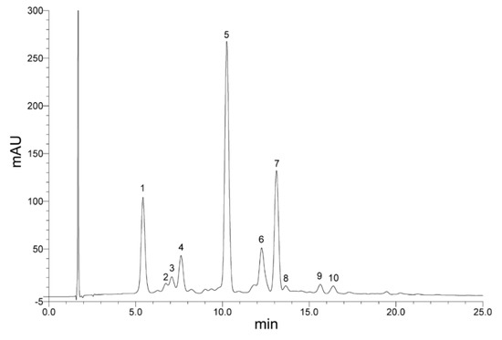 Figure 4 corresponds to the chromatogram of anthocyanins present in the blue corn extract. Cyanidin-3-glucoside (peak 1) and pelargonidin-3-glucoside (peak 3) were identified by their retention times with concentrations of 215.50 mg/100 g d.b. and 31.70 mg/100 g d.b., respectively. Additionally, several unidentified anthocyanins were detected, as peaks, 2, 4, 5, 6, 7, 8, 9, and 10. The proportion of the identified anthocyanins cy-3-glu and pg-3-glu was 15.74% and 4.97%, respectively. However, 2 peaks were found with higher proportions than cy-3-glu: peak 5 with 39.25% and peak 7 with 17.88%, which may be acyl-type anthocyanins, as well as 2 peaks higher than pg-3-glu: peak 4 with 7.66% and peak 6 with 9.35%. Acylated anthocyanins in similar chromatograms of pigmented corns have been reported [18,20,22].