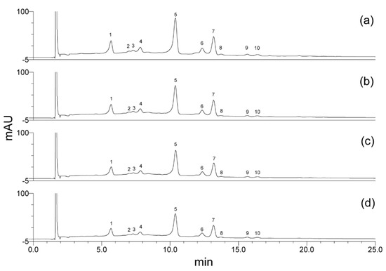 HPLC chromatograms of encapsulated blue corn powders anthocyanins obtained by spray drying at different agave fructan addition. (a) 6%, (b) 8%, (c) 10%, (d) 12%. Peak 1: cyanidin-3-glucosise, peak 3: pelargonidin-3-glucoside, peaks 2, 4, 5, 6, 7, 8, 9, 10: not identified.