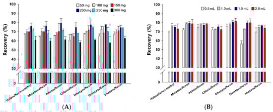 In order to achieve satisfactory cleanup, we optimized the amount of adsorbent used. The effect of C18 in the 50–300 mg range was examined at a fortified level of 0.05 mg/kg. Water (1 mL) was added to promote the adsorption of the analytes in the acetonitrile onto the C18. As shown in Figure 1A, the recoveries depend on the sulfonylurea herbicide. It is evident that less than 200 mg of C18 provides lower recoveries for all tested herbicides (Figure 1A). Lower recoveries were observed when the amount of C18 was increased from 200 to 300 mg, with the lowest recoveries observed with 300 mg of C18 (Figure 1A). The optimized amount of C18 used in the cleanup step was sufficient to remove matrix interferences, and thus led to an improvement of target analytes detection and their recoveries [22]. Consequently, 200 mg of C18 was selected for the adsorption of the target herbicides in this study. Leandro et al. [23] reported that the addition of 200 mg of the C18 sorbent led to an effective reduction of nonpolar analytes.