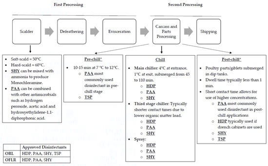 Moreover, during processing, carcasses that are contaminated with fecal matter or digestive tract content as determined by visual inspection right after evisceration may still pass inspection if reprocessed properly [21]. Two methods of reprocessing include on-line reprocessing (OLR) and off-line reprocessing (OFLR). Processing plants may use either or both forms of reprocessing. In OLR, contaminated carcasses can be reprocessed manually by trimming away contaminated parts and/or treated with an antimicrobial along with poultry carcasses that are not contaminated on the main line. In contrast, OFLR entails taking out contaminated carcasses off the main line where they can be reprocessed manually by trimming away contaminated parts and/or treated with an antimicrobial, away from the visually uncontaminated carcasses. Processing plants may use either or both forms of reprocessing. Then, before carcass chilling, carcasses are visually inspected again for fecal contamination using guidelines provided by the Food Safety Inspection and Inspection Service Directive in order to comply with the zero-tolerance standard that requires carcasses to be free of fecal contamination before entering the chiller tank [22,23]. While disinfectants are used in both first and second processing, their application, contact time and temperature may differ. Similarly, disinfectants approved for use during OLR and OFLR may differ in the application, contact time and temperature [24]. For the purposes of this review, only disinfectants commonly used during poultry processing will be reviewed, as intervention protocols may vary greatly across poultry processing plants. Popular disinfectants include hexadecylpyridinium chloride (HDP), peracetic acid (PAA), sodium hypochlorite (SHY) and trisodium phosphate (TSP) [25,26]. While PAA is the most commonly used disinfectant in both pre- and post-chill applications, HDP is most commonly used in post-chill applications when drench cabinets are used [27]. Additionally, both HDP and PAA can be used for OLR and OFLR [24]. SHY and TSP are also commonly used in post-chill applications [25]. In terms of reprocessing, SHY is only allowed in OFLR, although when it is used in combination with other disinfectants it can be used in OLR as well. In contrast, TSP is only allowed in OLR. Figure 1 provides a schematic overview of poultry processing along with information on HDP, PAA, SHY and TSP.
