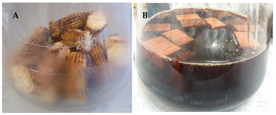 After the adsorption process, the OWC and CC were extracted from the broth and allowed to dry for 4 h. A 3 L fermentation volume was used for this study. Four pieces of corncobs (2 pieces yeast, 2 pieces Acetic Acid Bacteria) (Table 2) were used for inoculation in one flask. Twenty pieces of oak wood chips (Figure 1B) were used for inoculation in another flask (10 pieces yeast, 10 pieces AAB) (Table 2).