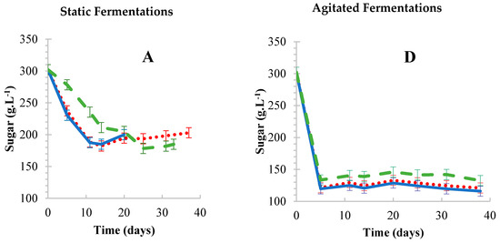 Chemical developments under static (A–C) and agitated (D–F) conditions. Sugar (A,D), alcohol (B,E) and total acid (C,F) developments during fermentation.