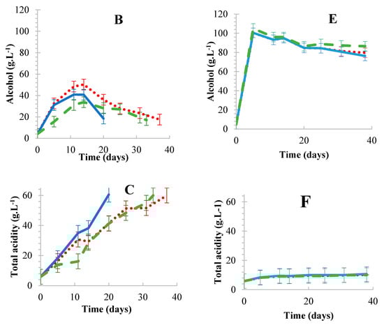 Nevertheless, total acid formation, which is a key step in BSV production was higher (1.42–1.56 g·L−1·day−1) at LA (Figure 3C) as compared to HA (0.14–1.2 g·L−1·day−1) (Figure 3F) for cell immobilized treatments. However, FFC completed the fermentations under both aeration settings with acetification rates of 1.27 and 1.46 g·L−1·day−1 for HA and LA, respectively. Additionally, over oxidation has been reported as a common challenge in most vinegar production systems [10]. It seems unlikely that the excessive/increased oxidation rates may have affected the fermentations in this study; since the alcohol profiles under HA and LA conditions (Figure 3B,E) were similar to some degree. Other studies reported higher acetification rates compared to the current study when aeration was employed. Rubio-Fernández et al. [44] reported acetification rates of 17.24 and 32.4 g·L−1·day−1 for wine vinegar production when air and oxygen rich air (0.06 vvm) were used respectively. Additionally, Qi et al. [52] reported acetification rates of 43.44 g·L−1·day−1 for industrial vinegar production when oxygen (0.13 vvm m−1) was used. It is important to mention that the observations between the current study and other studies are influenced by several factors, which include media composition and the AAB strains used. The most obvious influential factor is that BSV fermentation involves high sugar concentration/high osmotic pressures with the simultaneous involvement of non-Saccharomyces yeasts and AAB. Furthermore, spirit vinegar production is generally faster than the production of other vinegars. It is unfortunate that there are no similar BSV studies with which to compare the current data, due to the traditional techniques used for Balsamic vinegar production.