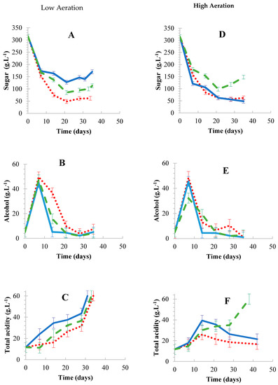 Chemical developments under low (A–C) and high (D–F) aeration. Sugar (A,D), alcohol (B,E) and total acid (C,F) developments during fermentation.