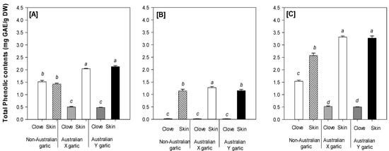 (A) Free, (B) bound, and (C) total (free + bound) TPC of different garlic cultivars and tissues. Data present mean ± SD (n = 3). Different letters in the same figure indicate significant difference at α = 0.05.