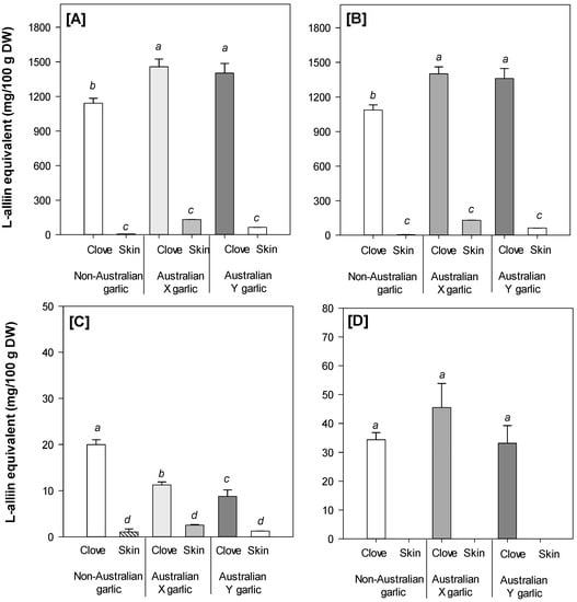 Three different organosulfur compounds could be identified by UHPLC-PDA-MS, including L-alliin, an alliin isomer, and methiin (Table 4). L-alliin was the predominant compound contributing to more than 90% of the total amount of organosulfur compounds in the garlic cloves (Figure 2). This is in agreement with a previous study, identifying L-alliin as the main organosulfur compound in garlic bulb [2]. Overall, L-alliin was found at significantly (p < 0.05) higher levels in the garlic cloves than in the garlic skin samples. However, the concentrations of L-alliin and total amount of organosulfur compounds were significantly (p < 0.05) higher in the Australian grown garlic cultivars than that in the commercial non-Australian grown garlic (both cloves and skin; Figure 2). An isomer of L-alliin was also identified in the garlic samples, but at a very low concentration (Table 4 and Figure 2). This obtained result is in agreement with the findings reported by Ichikawa et al. [21]. Furthermore, the profile of organosulfur compounds in the garlic samples investigated in the present study was similar to that reported by Horníčková et al. [39], who investigated 58 different garlic genotypes, with L-alliin being found as the predominant compound, followed by an alliin isomer and methiin as the minor ones. The characteristic distribution of bioactive compounds between the garlic cloves and skin (more organosulfur compounds in the cloves, but more phenolic compounds in the skin) may also affect the bioactive properties of these various garlic tissues.