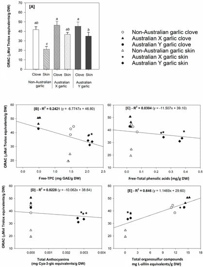 (A) Antioxidant capacity (Oxygen radical absorbance capacity—ORAC) and correlation between ORAC values and the determined (free) phytochemicals in the analyzed garlic samples: [B] ORAC vs. free total phenolic content (TPC), [C] ORAC vs. free total phenolic acids, [D] ORAC vs. total anthocyanins, and [E] ORAC vs. total organosulfur compounds. Different letters in Figure A indicate significant differences in antioxidant capacity among the samples tested at α = 0.05 (n = 3).