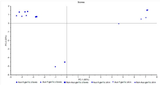 The PCA score plot (Figure 4) classifies the samples studied in three distinguished groups: the clove samples of the three garlic cultivars, the skin samples of the Australian grown garlic, and the skin sample of the commercial non-Australian grown garlic. This finding supports the UHPLC-PDA-MS results, which could show significant (p < 0.05) differences in the phytochemical profiles between garlic skin and cloves as well as the Australian grown garlic and commercial non-Australian grown garlic. Furthermore, the anthocyanins that are only present in the skin samples of the Australian grown garlic also contributed to the differentiation between Australian grown garlic skin and studied commercial garlic skin (PCA score plot, Figure 4).