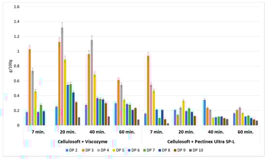 Yield of oligosaccharides with different degrees of polymerization obtained by enzymatic hydrolysis of apple pomace. Data represent mean from two independent experiments repeated three times. Error bars denote standard deviation (SD). Degree of polymerization (DP).