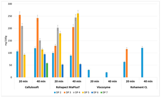 Enzymatic hydrolysis of AP was performed using a mixture of different commercial preparations of cellulase (Cellulosoft 1.5L or Rohament Cl) and pectinase (Viscozyme, Rapidase Smart, Pectinex Ultra SP-L or Rohapect Ma Plus T). The qualitative and quantitative composition of the generated oligosaccharides depended on the enzyme specificity and the period of enzymatic reaction. Enzymes are very effective tools for modifying the structure and functionality of pectin. Even after a seven min reaction time, oligosaccharides with degrees of polymerization ranging between DP2–DP6 and DP2–DP9 were generated, depending on the cellulolytic and pectic enzyme combination. This indicates that the application of enzymes is a feasible method for POS generation. However, the best effects were noted after 20 min of pomace hydrolysis using a mixture of Cellulosoft and Viscozyme, as well as for Rohament CL and Rohapect Ma Plus T, which gave the highest yields of total oligosaccharides, at 5.56 and 5.94 g/100 g d.w., respectively. These concentrations were 3.4- and 3.6-fold higher than the equivalent probe treated with Cellulosoft and Pectinex Ultra SP-L polygalacturonase. With extended enzymatic hydrolysis, a change in the pattern of oligosaccharides was observed. Higher oligomers were hydrolyzed to molecules of lower molecular weight (Figure 1).
