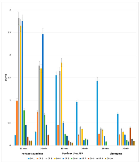 In contrast to the pectin extraction method used in this study, the duration of mild acid hydrolysis was optimized for 20 min. For incubation periods longer than 20 min, the total amount of POS dropped dramatically. The DP distributions after mixed hydrolysis are shown in Figure 3. Chromatographic analysis confirmed the presence of a mixture of oligosaccharides with different degrees of polymerization in the range of DP1–DP10 in all the tested samples. Acid hydrolysis followed by Rohapect Ma Plus T was the best method for producing large amounts of oligosaccharides, especially for short periods of enzymatic hydrolysis (10 min), at 10.81 g/100 g d.w. Moreover, applying acid hydrolysis followed by Rohapect Ma Plus T resulted in very low release of galacturonic acid (0.22 g/100 g d.w.). Its concentration after 10 min of incubation time was between 6.5-fold and 7-fold lower, in comparison to the samples with Viscozyme and Pectinex AFP, respectively. In the sample of AP treated with Viscozyme, no oligosaccharides with a DP higher than 6 were noticed after 10 min of enzymatic hydrolysis. The lowest concentration of total oligosaccharides was also noted, at 1.25 g/100 g d.w.