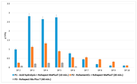 Therefore, the samples: P1—after mild acid hydrolysis followed by Rohapect Ma Plus T, P2—after enzymatic hydrolysis using a mixture of Rohament CL and Rohapect Ma Plus T, as well as the P3 sample containing only lower-order DPs (2-6 DP) prepared using Rohapect Ma Plus T (Figure 4), were submitted to analysis to determine their bifidogenic and antiadhesive properties.