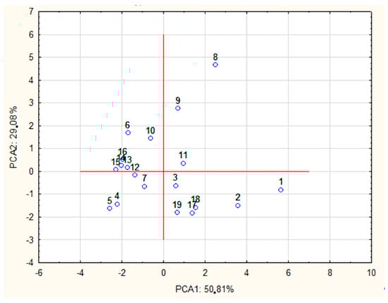 PCA of the olidosaccharides obtained by different hydrolytic treatments, where 1—AH + Rohapect MaPlusT (10 min), 2—AH + Rohapect MaPlusT (30 min), 3—AH + Pectinex UltraAFP (10 min), 4—AH + Pectinex UltraAFP (30 min), 5—AH + Viscozyme (10 min), 6—AH + Viscozyme (30 min), 7—Cellulosoft + Viscozyme (7 min), 8—Cellulosoft + Viscozyme (20 min), 9—Cellulosoft + Viscozyme (40 min), 10—Cellulosoft + Viscozyme (60 min), 11—Cellulosoft + Viscozyme (80 min), 12—Cellulosoft + Pectinex UltraSPL (7 min), 13—Cellulosoft + Pectinex UltraSPL (20 min), 14—Cellulosoft + Pectinex UltraSPL (40 min), 15—Cellulosoft + Pectinex UltraSPL (60 min), 16—Cellulosoft + Pectinex UltraSPL (80 min), 17—Rohament Cl + Rohapect MaPlusT (10 min), 18—Rohament Cl + Rohapect MaPlusT (20 min), 19—Rohament Cl + Rohapect MaPlusT (30 min). * Different hydrolytic treatments were described as: Enzyme type (hydrolysis time); AH—acid hydrolysis.