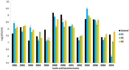 All the tested strains showed strong adhesion to Caco-2 cells. The number of adhered bacteria in the control sample and in the samples incubated with AP hydrolysate depended on the strain (Figure 6). Among the control samples, the highest adhesion of bacteria to Caco-2 cells was observed for Lb. plantarum 0989 and 0990 (above 1 × 109 CFU/mL of adhered bacteria). The least adhesive was Lb. brevis 0983 (1.4 × 107 CFU/mL of adhered bacteria). These abilities also depended on the type of prebiotic preparation. The presence of P1 preparation, containing oligosaccharides with DP 2–10, reduced the number of adhered bacteria by 1 logarithmic unit in most cases (9 out of 13 strains). The presence of preparation P2 appeared to increase the number of adhered Lactobacillus sp. bacteria (7 out of 11 strains). Only preparation P3, which contained oligosaccharides with DP 1–6, caused an increase in the number of adhered Leuconostoc sp. bacteria.