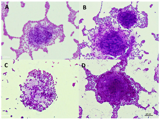 For microscopic visualization, the following procedure was carried out using a Lab-TekTM microplate 8-well (Nunc, Thermo Fisher Scientific, Waltham, MA, USA). After incubation of the tested strains for 2 h with AP hydrolysates and Caco-2 cells, non-adhered bacteria were removed. The wells were washed with PBS (pH 7.2) and fixed with 70% methanol for 15 min at ambient temperature. They were then stained with 0.5% crystal violet (Sigma-Aldrich, St. Louis, MO, USA). After that, the wells were washed with 70% ethanol and dried overnight. The samples were observed at ×1000 magnification under a microscope (Nikon, Tokyo, Japan) connected to a camera (Nikon Digital Sight DS-U3, Nikon, Tokyo, Japan) using imaging software (NIS-elements BR 3.0, Nikon, Tokyo, Japan).